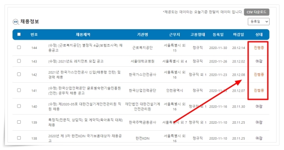 ▼ 채용정보 리스트에서 우측 상태을 보면 진행중/마감이 있습니다. 확인 후 클릭해 보세요.