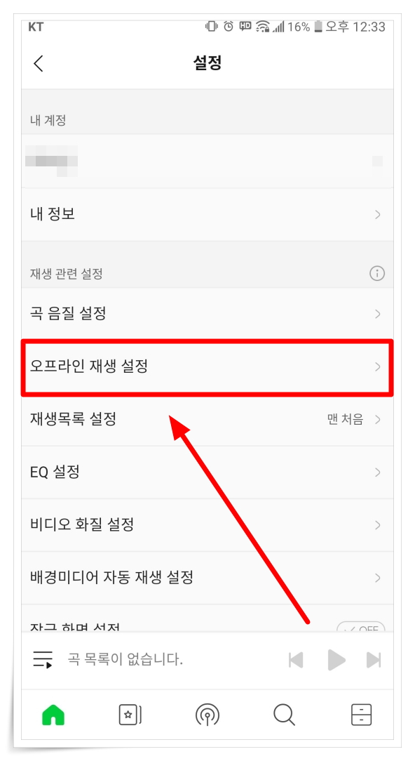 ▼ 상단 설정에서 "OFFLINE"을 선택하면 다운받은 음원을 들을 수 있어요.