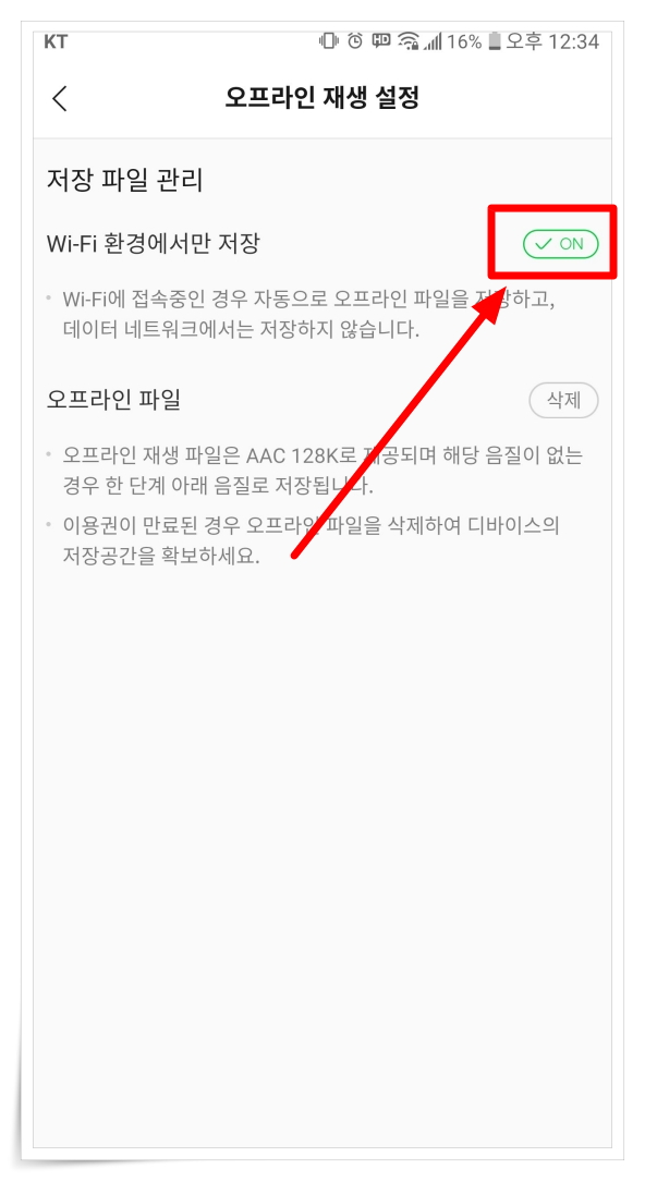 ▼ 저장 파일 관리에서 "Wi-Fi 환경에서만 저장" ON을 해주세요. 그러면 와이파이 접속중에 자동으로 음원파일을 저장합니다.