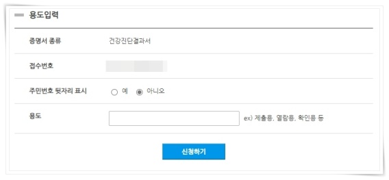 7. 용도 입력 후 "신청하기"을 클릭해 주세요.