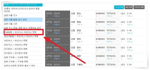 ▼ 그리고 자신의 한글 이름을 일본어로 변환하실려면 좌측 "한글발음"을 클릭해 보세요.