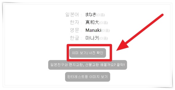 ▼ 그러면 자동으로 이름이 생성되는데요. 마음에 들지 않는다면 새로고침을 통해 다시 생성할 수 있습니다. 그리고 마음에 드는 이름을 찾았다면 하단 "의미보기/사전확인"을 클릭해 보세요.