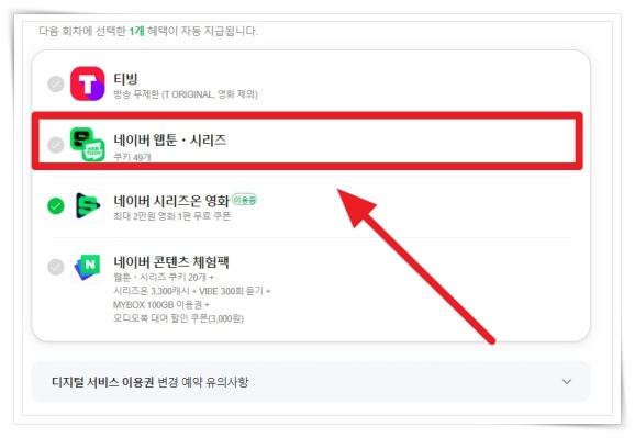 ▼ 디지털 서비스 이용권에서 "네이버 웹툰"을 선택하면 쿠키가 지급됩니다.