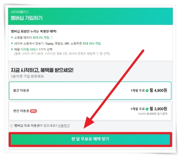 현재 네이버 플러스 멤버십에 가입하면 가입자에게 5000원과 쿠키 49개를 제공하고 있습니다. 가입은 한 달간 무료이고 추후에 언제든지 해기가 가능합니다.